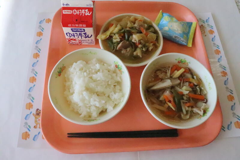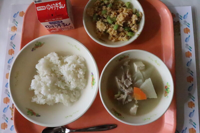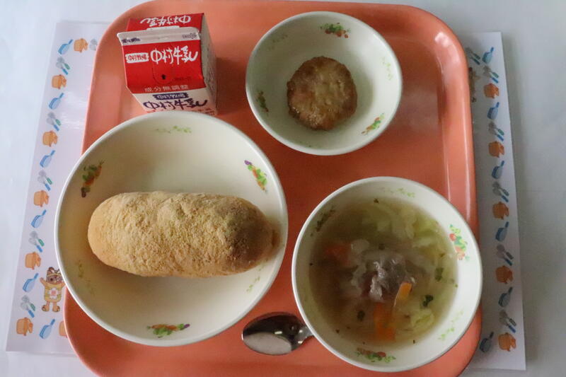 きな粉揚げパン、玄米入りつくね、マロニーのスープ、牛乳