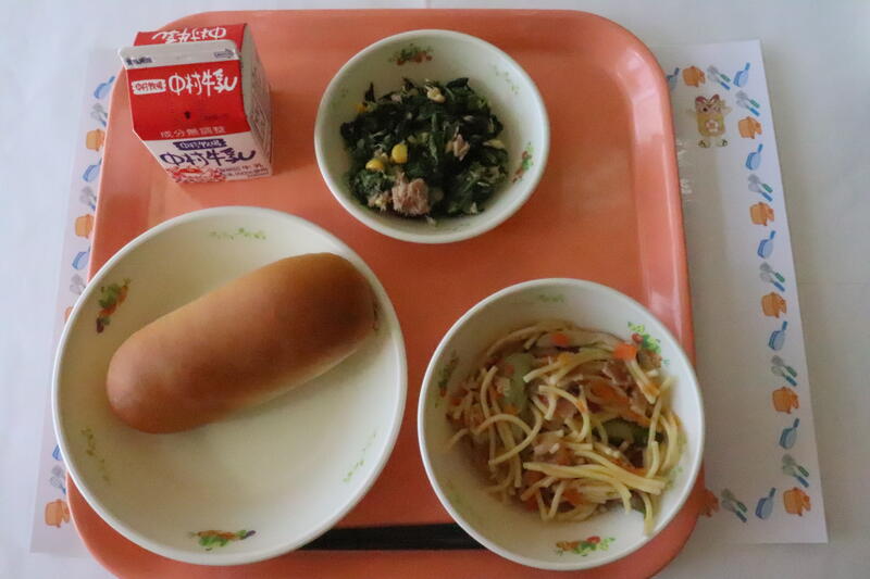 減量黒糖パン、きのこスパゲティ、レモン和え、牛乳