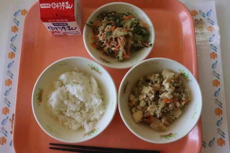 ごはん、マーボー豆腐、バンバンジー、牛乳