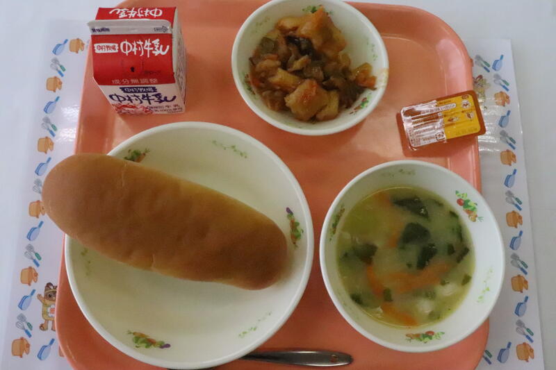コッペパン、1食蜂蜜マーガリンジャム、タラチリソース、中華コーンスープ、牛乳