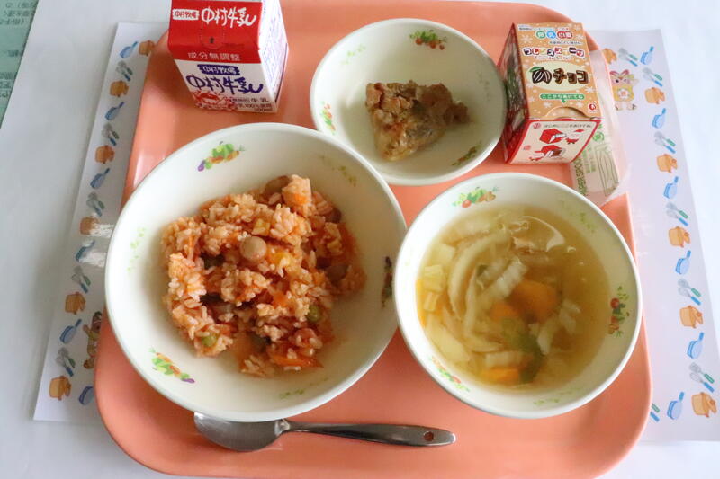 クリスマスピラフ、タンドリーチキン、カボチャのスープ、クリスマスケーキ、牛乳