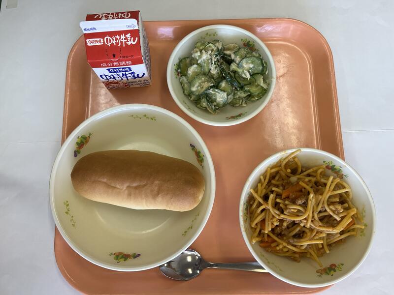 減量ミルクパン ミートビーンズスパゲティ グリーンサラダ 牛乳