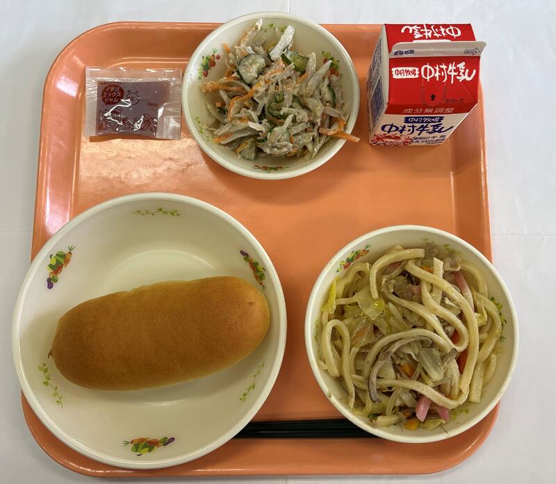 減量コッペパン いちごジャム 焼うどん きゅうりとごぼうのサラダ 牛乳