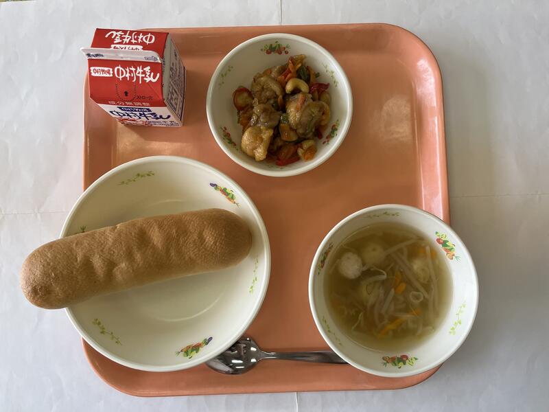 米粉パン 鶏肉とカシューナッツのソテー 肉団子スープ 牛乳