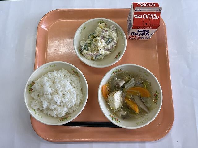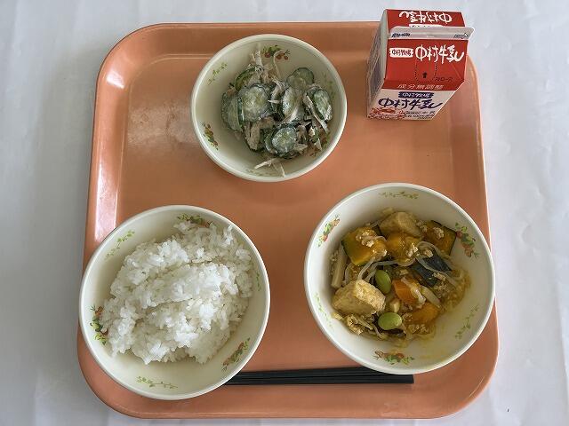ごはん かぼちゃのそぼろ煮 きゅうりとごぼうのマヨネーズ和え 牛乳