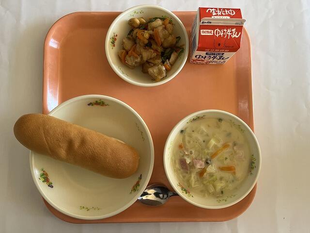 米粉パン クリームスープ 鶏肉とカシューナッツのソテー 牛乳