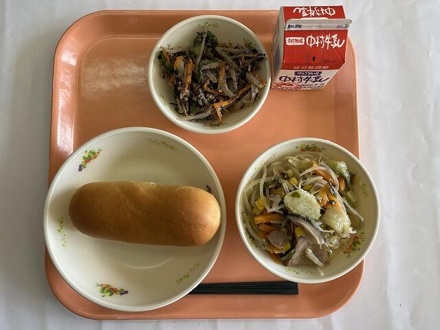 減量ミルクパン とんこつラーメン ひじきとごぼうのサラダ 牛乳