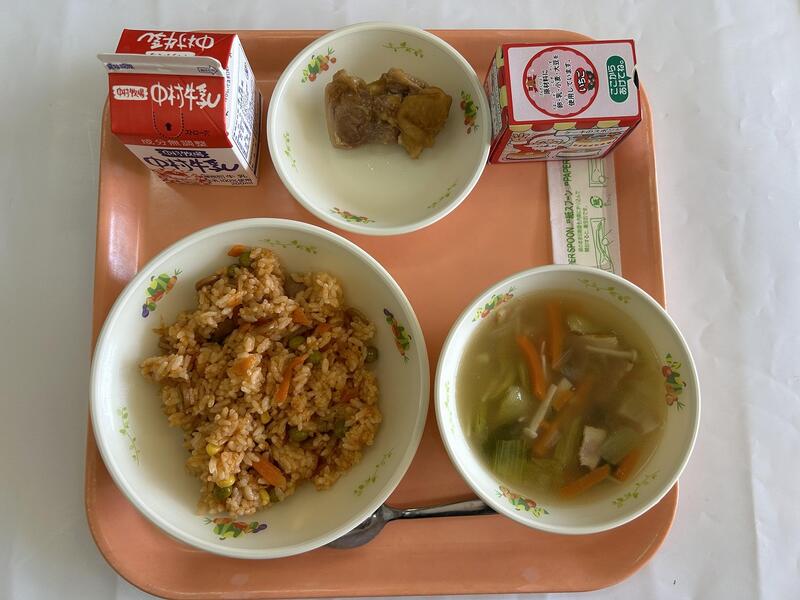 クリスマスピラフ 鶏肉のバーベキューソース焼き チンゲン菜のスープ クリスマスケーキ 牛乳
