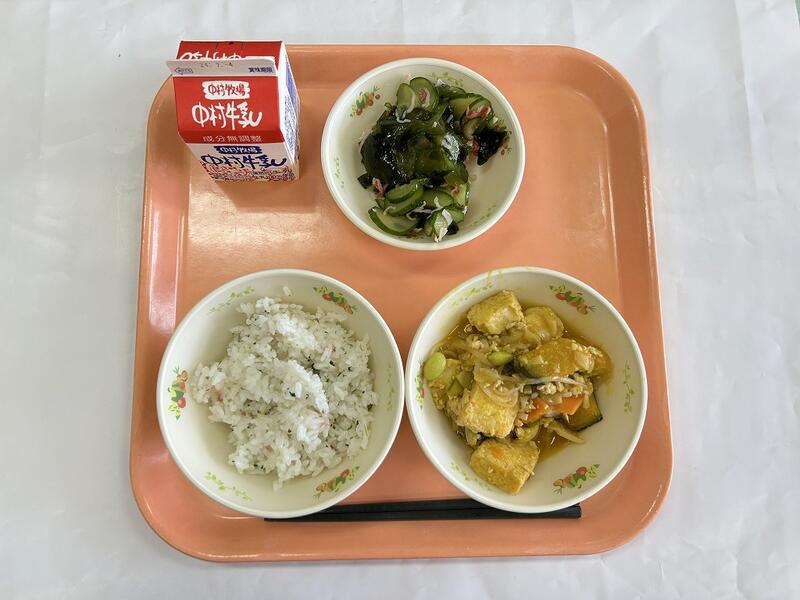 赤かぶ青菜ご飯 南瓜のそぼろ煮 胡瓜とわかめの酢の物 牛乳