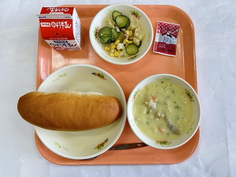 コッペパン エスニカンシチュー カリフラワーサラダ マーシャルビーンズ 牛乳