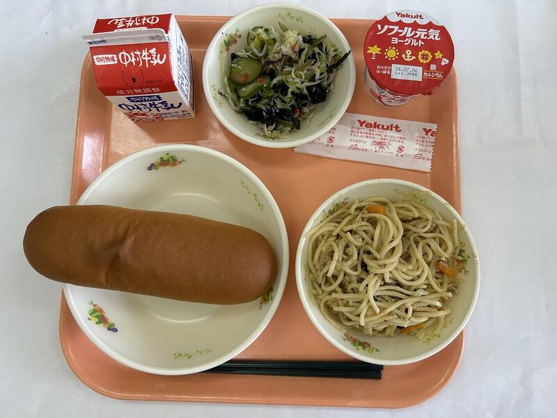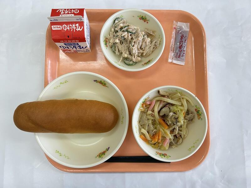 減量ミルクパン 焼きうどん ごぼうのオーロラサラダ いちごジャム 牛乳