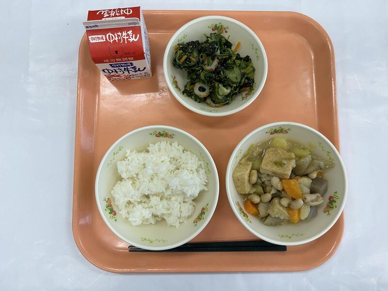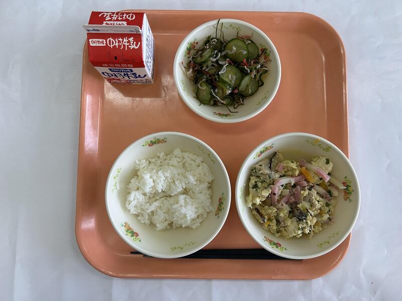 赤かぶ青菜ご飯 南瓜のそぼろ煮 胡瓜とわかめの酢の物 牛乳