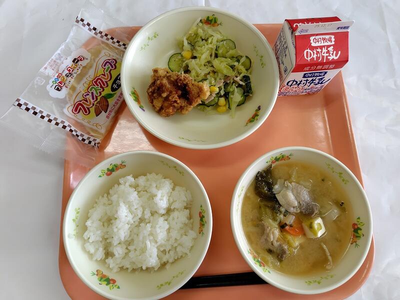 減量ごはん キムチ汁 から揚げ ハムサラダ チョコクレープ 牛乳