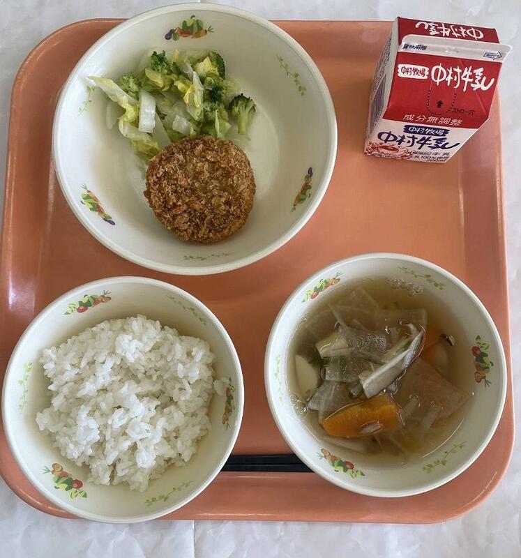 ごはん メンチカツ 添え野菜 八杯汁 牛乳