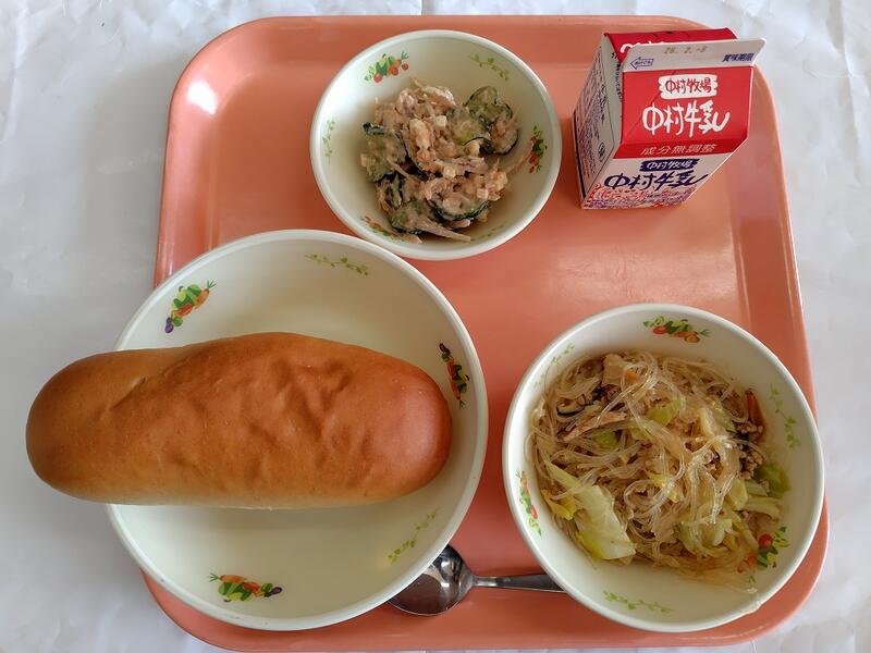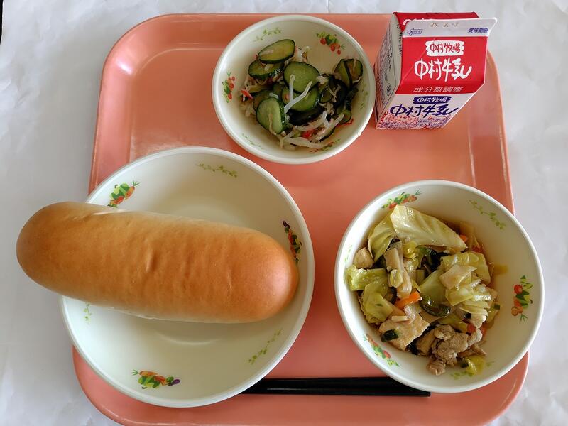チーズパン ホイコーロー 中華サラダ 牛乳
