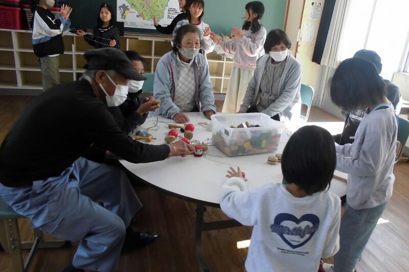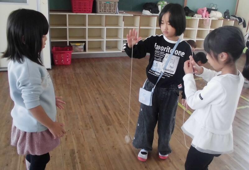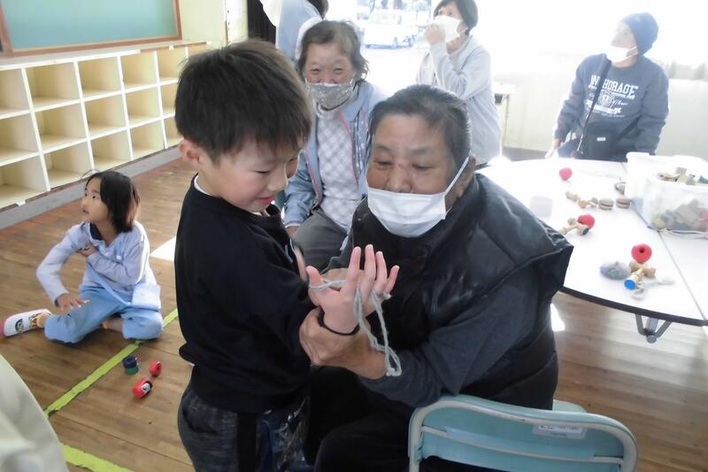 今日は、5名の方が来てくださって、子ども達と話したり昔の遊びをしたりしながら楽しく過ごしてくださいました。子ども達は、たくさん来てくださったのでとても喜び、自己紹介をして、好きな遊びに分かれて、いろいろお話ししました。はじめは、照れたりどう話していいか戸惑ったりしていましたが、だんだん慣れてきて楽しく過ごしました。地域の方と笑顔いっぱい、笑いもいっぱい、つながりができ、顔見知りにもなりうれしい楽しい時間でした。ありがとうございました。今日来てくださった方は、運動会にも来てくださったとのこと。「高崎音頭に出たよ」「思い出したころには終わった」「来年は2回にしましょうかね」