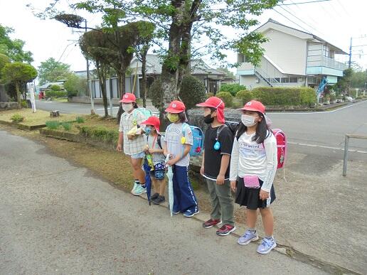 子どもたちは登校後、校門で朝のあいさつをして、江平小の目指す児童像「よく考える子、心豊かな子、たくましい子」を全員で言います。登校班長が「今日も一日がんばりましょう。」と呼びかけ、班員が「はい。」と応じます。