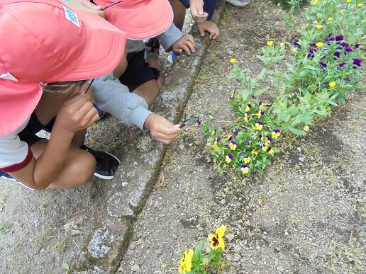 3年生が理科で虫めがねを使って生き物の観察をしていました。