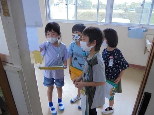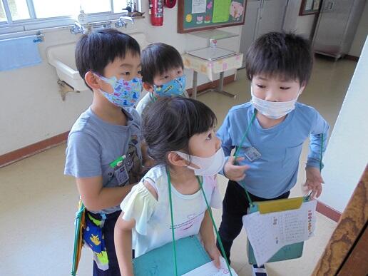 2年生のお兄さん・お姉さんが1年生を連れていろいろな教室をまわり、やさしく教えていました。