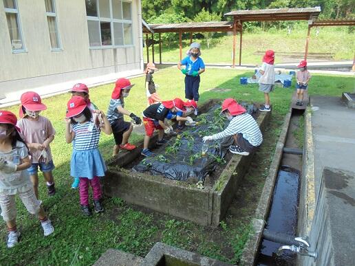 1・2年生が生活科でサツマイモの苗植えを行いました。安納芋や宮崎紅などの品種のようです。