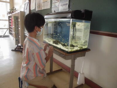先日、安藤先生が水槽を洗ってくださいました。すると、児童も職員も水槽の前で、足を止め、グッピーの様子を観察する姿を多く見かけるようになりました。