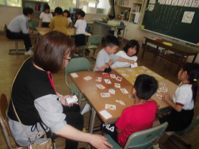始めは、英語で曜日と食べ物の名前を歌やゲームで繰り返し練習しました。途中、「サラダ」は、外国ではサラダのダをはっきり言うと伝わらない話など、先生の海外旅行でのエピソードに児童は驚きながらも楽しく学んでいました。