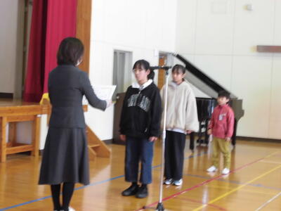 2年の岩下さんと4年の永田さんがそれぞれ、2学期を振り返り、がんばったことやできるようになったこと、さらに3学期の抱負を作文発表しました。発表では、苦手なことも練習し、勇気を持って挑戦したことでできるようになったことや自分から進んでお手伝いをするようになったこと等、成長した2学期になったことがよく分かり、嬉しくなりました。