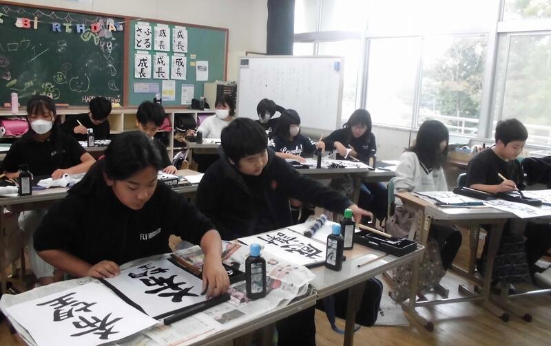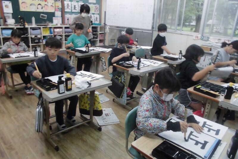 雨が降り肌寒い日となりました。運動会が終わり、この一週間は落ち着いて次の目標に向かっています。今日は、3・4年、5・6年とも毛筆習字の時間がありました。静かに心を落ち着けて、納得のいく作品になるように丁寧に書いていました。