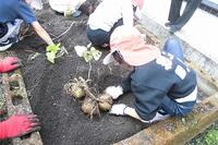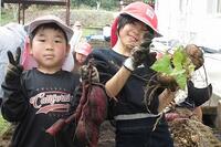 イモの回りの土を丁寧にのけてはのけ・・、ひっぱってもなかなか抜けないイモ。子供たちは友達と力を合わせてイモ掘りをがんばっていました。