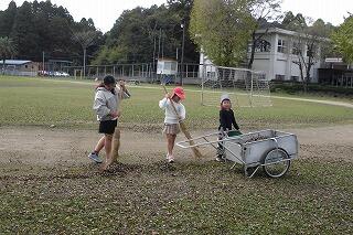 11月20日(水) 清掃時間に運動場の落ち葉をホウキで掃きました。大きなセンダンの木やイチョウの木の下にあった一面の落ち葉があっという間にきれいになったのは、みんなの力のお陰です。