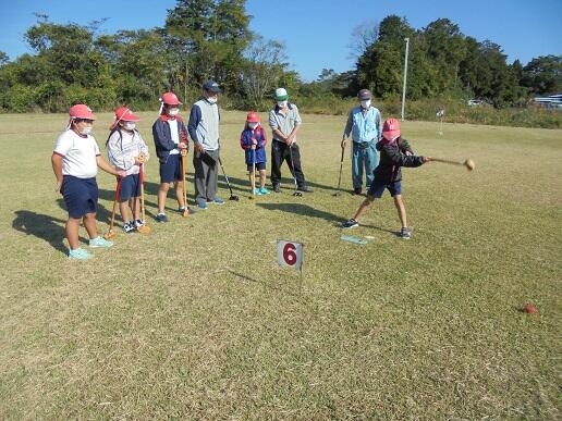 3・4年生が地域の高齢者の方々とふれあいグラウンドゴルフを行いました。