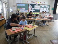 あるお母さんは、「家ではこんなに(量)食べない。学校ではたくさん食べているのですね。」と驚かれていました。栄養バランスのよい、おいしい給食を笑顔でいただきました。