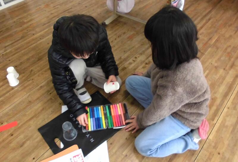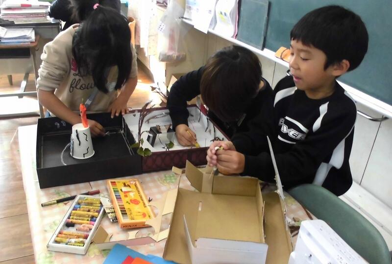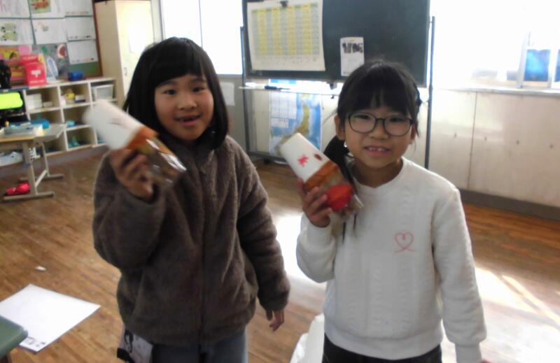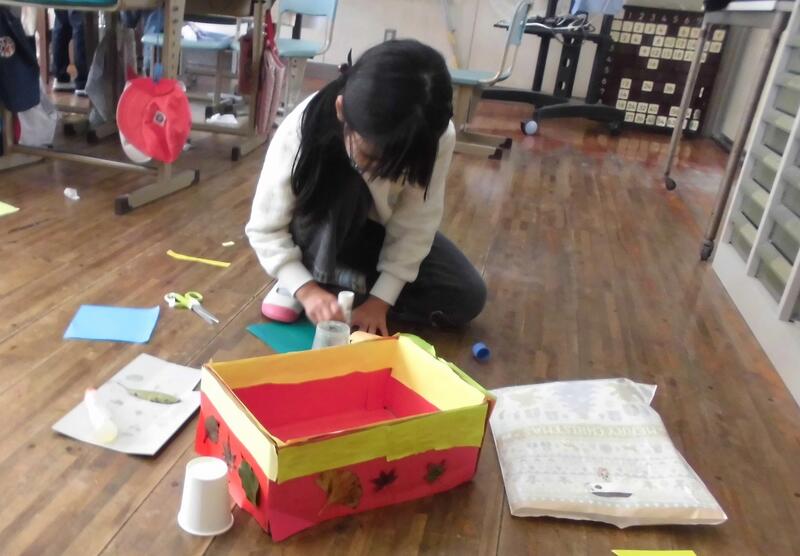 1・2年生が、図工の時間に箱や紙コップなどを使って、迷路、そり、マラカス、すずなどを楽しくつくっていました。集めた落ち葉を使ってひと工夫させていました。マラカスの中にはどんぐり、すずの持ち手は木の枝、迷路には仕掛け、そりには「サンタクロースを乗せよう」