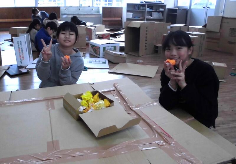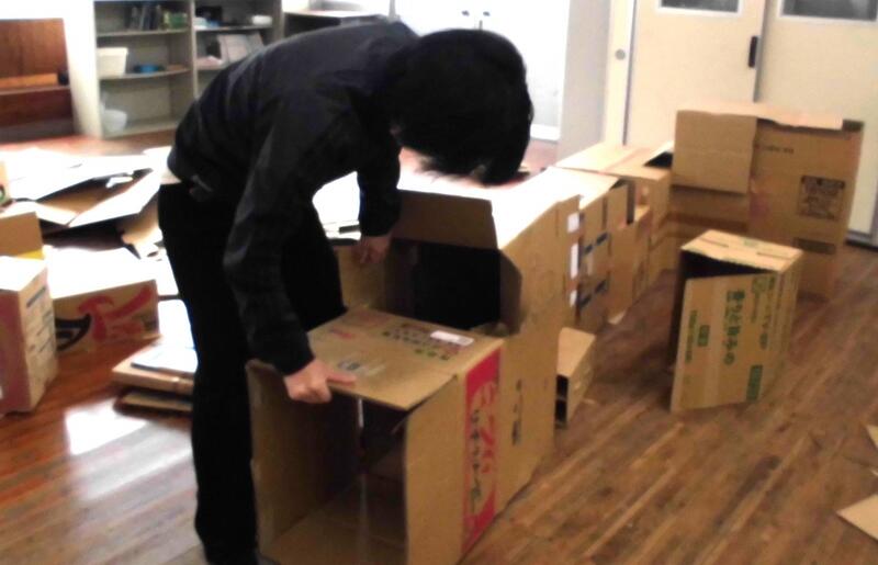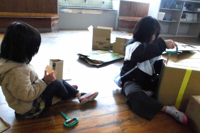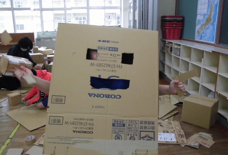 3・4年生と先生が、段ボールを使ってつくりたいものを楽しくつくっていました。高い塔、長いトンネル、ロボット、家、こたつ・・・子どもの発想はおもしろいですね。