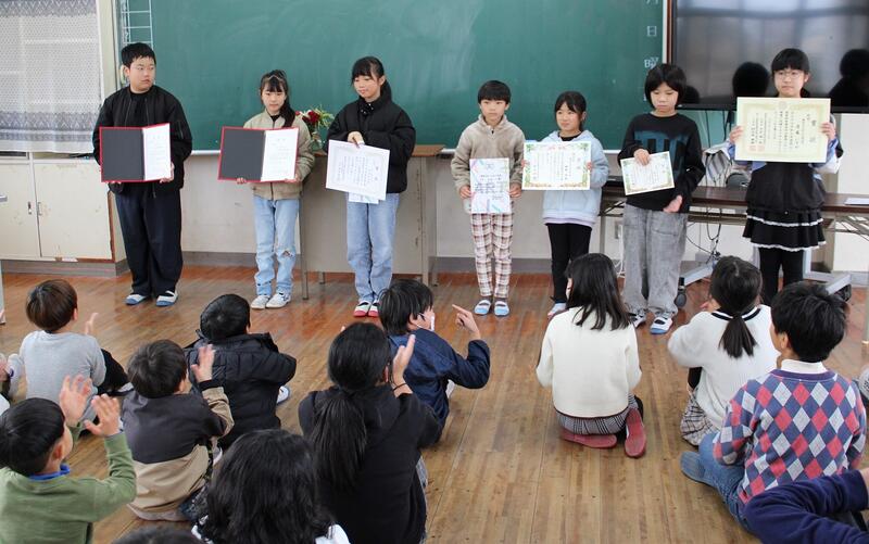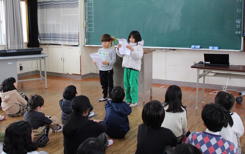 終業式では、2年生の2人が、これまでを振り返って頑張ったことや思い出を発表しました。大きな声で抑揚をつけた話し方が大変すばらしかったです。校長先生の話では、2学期を「笑顔」「感謝」「挑戦」について写真を見ながら振り返り、たくさんの行事をとおして、頑張ったり楽しかったり人とかかわったりしながら大きく成長したことをみんなで実感しました。表彰もたくさんありました。本当に実りのある伸びる2学期でした。