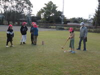 11月13日(月) 3・4年生は、2時間目に地域の方と世代間交流「グランドゴルフ」をしました。小学校と隣接している江平ふれあい広場でしました。