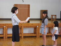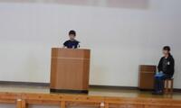 始めは、児童の1学期を振り返っての作文発表でした。3年生代表の石塚昌彦さん、6年生代表の室田光さんがそれぞれ発表を行いました。石塚さんは、3年生になってたくさんの先生方に教わったことやそれに伴う移動教室の多さ等に触れ、算数の筆算ができるようになった喜びを発表しました。また、室田さんは、工夫して学習したことで漢字を覚えられたことや家族に言われなくても自分からできるようになったこと、修学旅行での出来事などを発表しました。