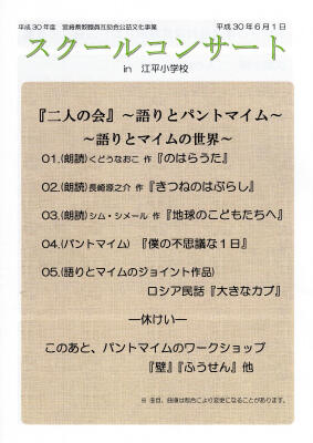 10:35~12:00に体育館で朗読とパントマイムを内容として計画しています。地域の方々、保護者の方も無料でご覧になれます。