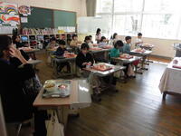 2時間目から昼休み時間まで、ずっと一緒に活動しました。4時間目、1年生の教室では国語「話す・聞く」の学習でした。身の回りの物からクイズを作って、ヒントを考えて出題し、聞く人が答える学習です。ペアになってクイズを作るとき江平小とか笛水小とか学校関係なく仲良く話し合っている様子を見て、交流学習は成功しているなと思いました。