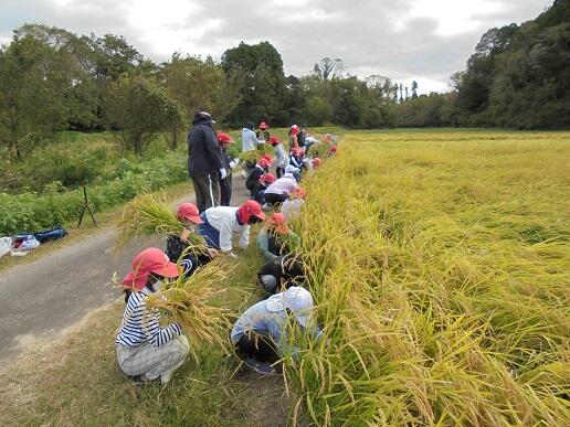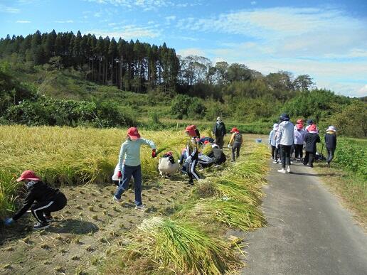 本日、3年生から6年生までの児童が鎌による稲刈り体験を行いました。