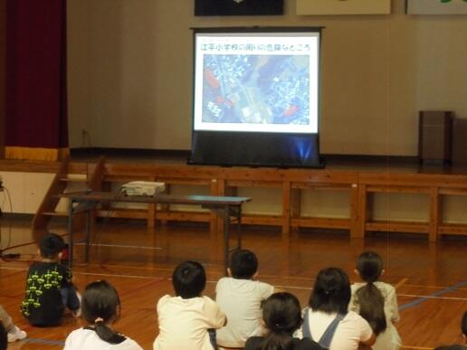 江平小学校周辺の危険なところも教えてもらい、日ごろの備えと早めの避難の大切さを学びました。