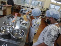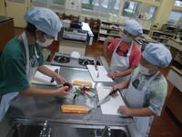 調理実習前から、児童が楽しみにしていたので、クラブ活動の時間に、家庭科室をのぞいてみました。そこでは、グループで協力し合って、粉の分量を量ったり、包丁で指を切らないようにタコを切り分けたりしていました。また、材料をすべてボールに入れたら、たこ焼きプレートで丸く焼いていました。