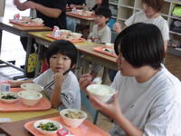 あるお母さんは、「家ではこんなに(量)食べない。学校ではたくさん食べているのですね。」と驚かれていました。栄養バランスのよい、おいしい給食を笑顔でいただきました。
