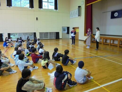 全校集会において、6年生への転入児と通訳の先生の紹介がありました。