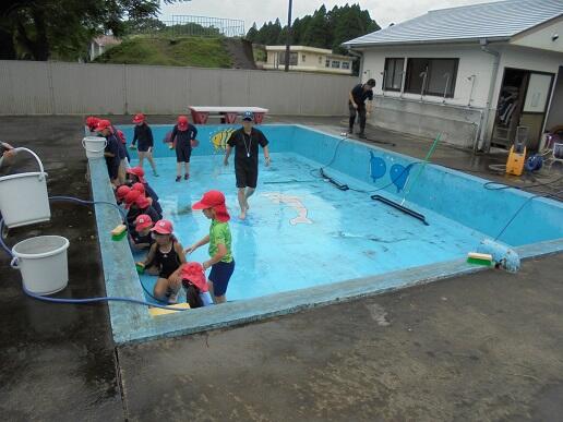 今日はプール掃除を行いました。小プールを3・4年生が、大プールを5・6年生が担当しました。