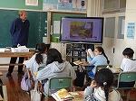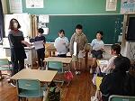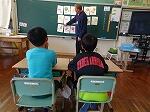 さて、1・2年生は、ALTのペリー先生と一緒に外国語の学習でした。黒板いっぱいに貼られた果物について英語での言い方を学習します。発音もペリー先生の真似をしてばっちりです。その後、果物のカードを一つ隠し、それが何だったかを思い出して英語で答えるというゲームなどで楽しんでいました。