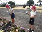 1・2年生は生活科で、チューリップの観察をしていました。ピンク色の1つのチューリップは、もう咲いていましたが、他のはつぼみが付いているのはありましたが、まだ咲いていませんでした。2人は観察しながら絵を描き、気付いたことをカードにまとめていました。