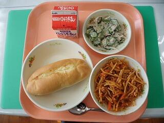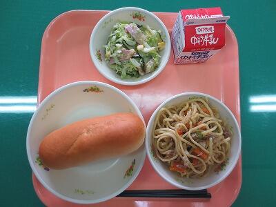 ・減量マヨネーズパン ・ボロネーゼスパゲティ ・きゅうりとごぼうのマヨネーズ和え ・牛乳