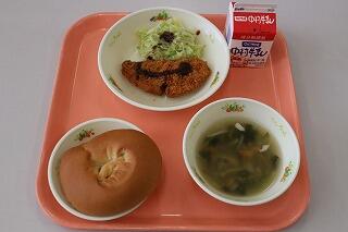 ・丸黒糖パン ・鮭フライ ・キャベツ ・きのこスープ ・1色ソーズ ・牛乳