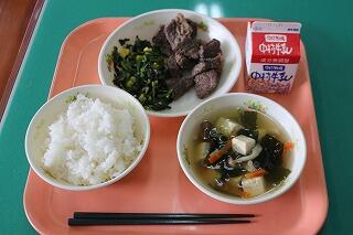 ・ごはん ・みやこんじょサイコロステーキ ・ほうれん草ソテー ・わかめスープ ・牛乳